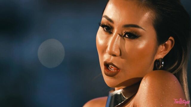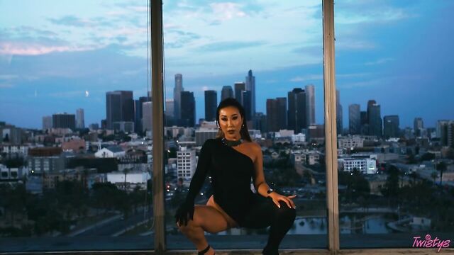 Description: High up in the studio surrounded by the stunning city skyline of downtown LA, October Treat of the Month Nicole Doshi looks glam and fabulous in a short skirt and knee-high boots as she seductively dances and twerks her firm ass. The kinky brunette teases the camera with her gorgeous body, before sliding down her black thong and putting the lingerie into her mouth. Next, with her long hair slicked back, Nicole dazzles in a sexy one-piece which shows off her mouthwatering curves and slender legs. By the time it is dark outside, the feisty babe has stripped completely naked so that we have a full, unhindered view of her pussy and beautiful round tits. Feeling horny, Nicole sits astride a chair and starts playing with herself until she orgasms, then she finishes by tasting her sweet pussy juices!