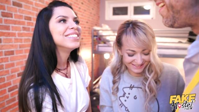 Description:Kira Queen and her girlfriend, Lola Shine, rent a room in the Fake Hostel, and as they lounge around, Lutro Steel barges in claiming to be a visa inspector. Kira and Lola are skeptical, but hesitantly show Lutro their paperwork. Lutro tells him they don't have their section 10 visas, and section ten is called sex-tion for a reason! The ladies decide to ditch him and make a break for it, but when they see how big Lutro's dick is, they decide to stick around and have some fun. Kira gives Lutro a sloppy blowjob while he sucks Lola's tits, then the ladies suck his dick together. Kira and Lola take turns riding Lutro's big cock, each achieving orgasm, and then let him cover them both with a facial.