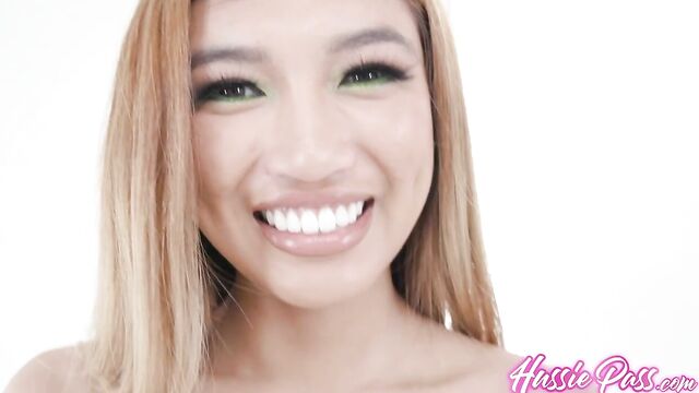 Description:Vivacious coed Clara Trinity is back on the Hussie Pass set today, and she wanted to take her biggest cock yet, so we paired her up with big-dick 19-year-old phenom Damion Dayski for this interracial Asian update! After director Johnny Robins helps us get reacquainted with the spinner cutie, Clara gets naked and uses her fingers to warm up her tight vagina before Damion steps in and lubes up her petite frame. Clara gets on her knees for the big reveal & then proceeds to suck and gag on that 12-inch cock. She rims his ass & gives him a footjob before Damion goes down to sample her coed cooch. Then he put it in! Clara takes damn near ALL of him missionary, folded up like a pretzel, reverse cowgirl, cowgirl, and doggystyle until Damion pulls out and cums on her pretty little face. We followed the 2 youthful lovers into the shower afterward...