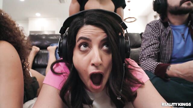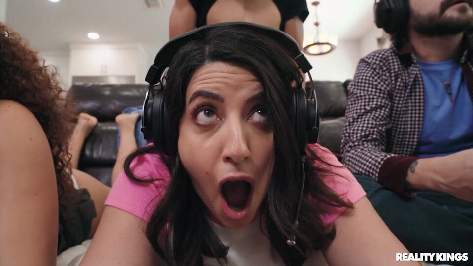 Description: Sarah Arabic's bf invited his buddies over to game, and now he's ignoring her! Sarah tries everything to get his attention, even flashing her big natural tits, and he still doesn't look up... but her friend Willow Ryder is more than interested! The girls start sucking each other's tits, and even scissoring right behind the guys. When Johnny Love notices what they're up to, they pull him onto the couch to let him motorboat them and suck out his cum. Dwayne Foxx catches sight of Sarah's big booty in her thong, so the babes take out his big cock and soon he gets to fuck them as they game.
