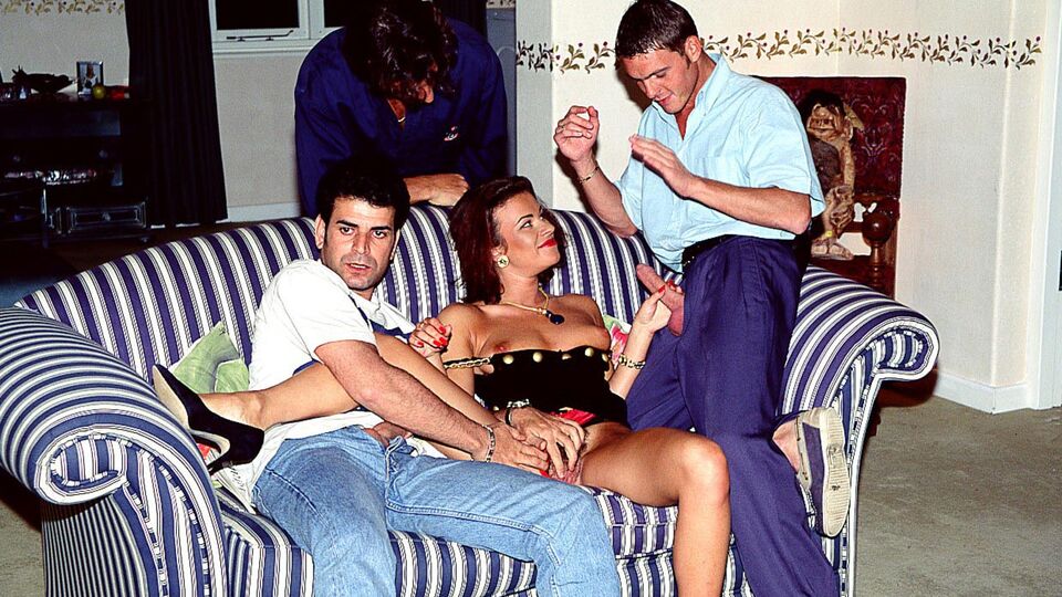 Description: A few guys sit around talking when Julia Spain starts stroking and sucking their cocks. One guy fucks her pussy while she sucks and strokes two other guys. Eventually two guys double penetrate her and her hairy pussy gets a solid workout. She gets multiple facial cumshots in the end.