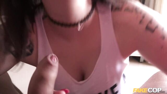 Description:Was wandering through my neighborhood and saw these massive tits peeking at me through a window! I approached their owner Harmony to explain there was a guy walking around being a bit of a sex pest, so it would be good to be careful. She was a bit cheeky at first, asking if he might have a camera, like me! But no, she told me there was no sex pest in her house, except maybe for her on a good day, and she'd thought I was a stripper, coming to her door in my uniform. Since I couldn't wait to get my big dick between her massive G-cup tits, and can't dance for shit, I offered to show this busty babe my truncheon instead. Soon enough, she was deepthroating my cock, offering me her tight pink pussy, and letting me decorate those big beautiful bouncing boobs with my spunk.