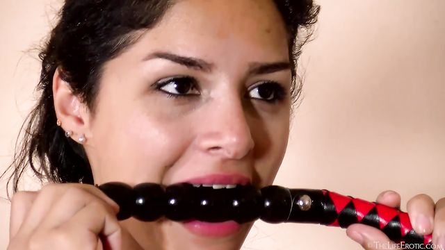 Description: Stunning Zoe A, a dark-eyed babe with a cute beauty mark, is as submissive as she is gorgeous. We join her as she selects bondage accessories for some kinky solo fun. Her fingers, manicured with peach polish, caress a red and black ball gag. Topless in front of an ornate vanity, she is wearing a red-lace thong, black fishnet stockings and high platform shoes.