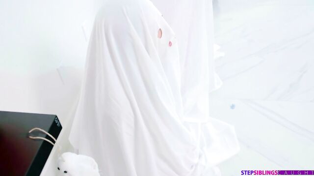 Description: Ricky Spanish is checking out some ghost decorations when his stepsister Lana Smalls and her friend Molly Little walk in. Lana is talking about wanting to fuck her stepdad, and she gets an idea when Ricky mentions that his dad is going to be looking in on the ghosts. The girls wait for Ricky to leave and then come back in, naked, to put the ghost costumes on themselves.Ricky returns and shoves his dick into first Lana's mouth and then Molly's. Molly goes on to sneeze, which causes her and Lana to each lift their sheets. Acting surprised it's Ricky instead of his dad, the girls exchange glances. Molly announces she wants to see Lana fuck her stepbrother, so the threesome relocates to the couch to make that happen.The girls kick it off with a double BJ. Then Lana gets on her knees to eat Molly out as she enjoys getting dicked down in doggy for Molly's eyes only. After the girls have swapped out so Molly can enjoy Ricky's hardon, Lana rides her stepbrother in reverse cowgirl. She cedes the D to Molly and trades out for riding Ricky's tongue. Molly gets on her back for Ricky to do her one last time, and then Lana takes it for the home stretch as she splays herself for Ricky. Pulling out, Ricky gives the girls a nice pop to enjoy.