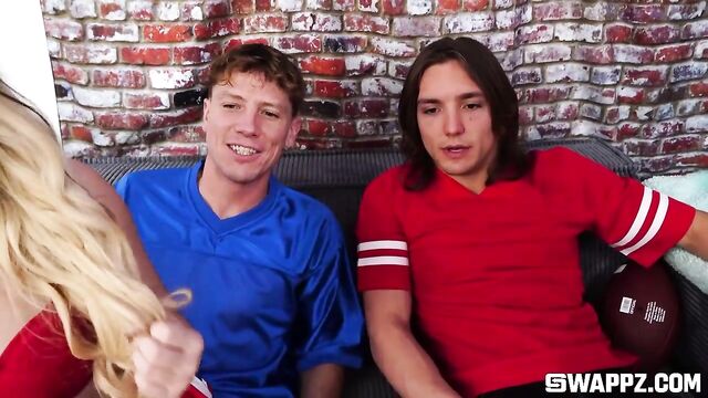 Description:So my friend thinks she can get more views than I can, but I’m willing to do anything for likes and comments from my followers! Everyone online loves Aria and Katie, but only one of us can be the winner. I know that if we shake our little tits and perfect bubble butts on camera, everyone will lose their minds. We move our party to the living room, where our stepbros are trying to watch the big game - the showdown of the year. But once they see our eager naked bodies, even they can’t help but say, “fuck it - this is better than any halftime show!” So we start messing around with each other’s stepbrother, but you know what would get even more views? Taking our own stepbrother’s cocks…