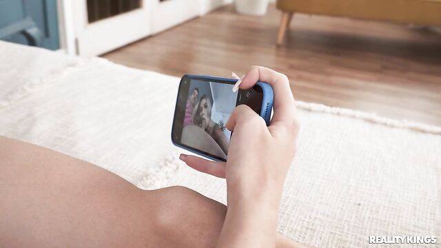 Description: Blonde Angelique Rose is getting texts from a creepy guy, so her roommate Jordi El Nino Polla suggests she should get rid of him by sending pics of herself with another guy...like him! They start out with selfies, and Angelique takes some of them kissing so the creeper gets the message. To be really really sure, she decides they should take pics of her sucking Jordi's dick! Angelique gets into it, and so does her lucky roomie. Soon she's riding his big cock on the bed and taking video as he pounds her.