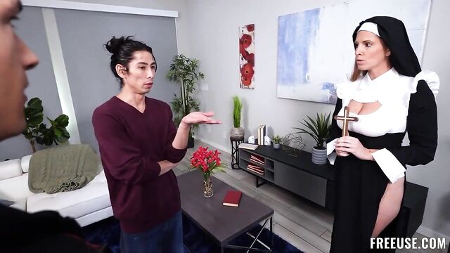 Description: David's stepbrother Jayden is acting like a completely different person now; his taste in music has changed, he's wearing dark clothes, and he's been going out at night. David thinks Jayden has been possessed by a demon, so he hired a nun to exorcise him. The exorcism expert notices everything that's wrong with Jayden right away and starts working. While she's busy trying to save the stepbrothers, both of them use her as a sex toy, pounding her as they explain the situation, making her suck their cocks dry as she reads a book about exorcisms, and licking her pussy as she gives them instructions on how to be saved. If they listen to her, they might be able to expel all the bad energies as they fuck her pussy.