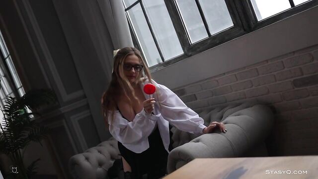 Description: If you are into sexy secretaries, you will love Video Release 664. The ecstatic striptease features Rita Fizzi, a stunning StasyQ model. She stands out for her elegant beauty and a touch of fetish that makes her unforgettable. All sexy and naughty, Rita Fizzi appears wearing a black skirt, matching stockings, a white shirt, and nerdy glasses. She sits in a leather chair while wrapping her sexy lips and tongue around a popsicle. It's not long before she takes her bra off and begins teasing her pink nipples with the sticky candy. Her eyes stay fixed on the camera as she continues to undress. If you stay long enough, you'll see the feminine goodies hidden beneath Riza's cute skirt. The gorgeous brunette will take her panties off for your eyes only, but that's only the beginning. The unique masterpiece won't stop until you have your share of naughty fun.