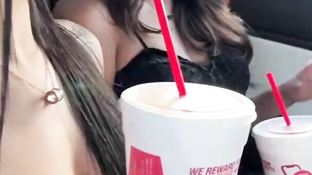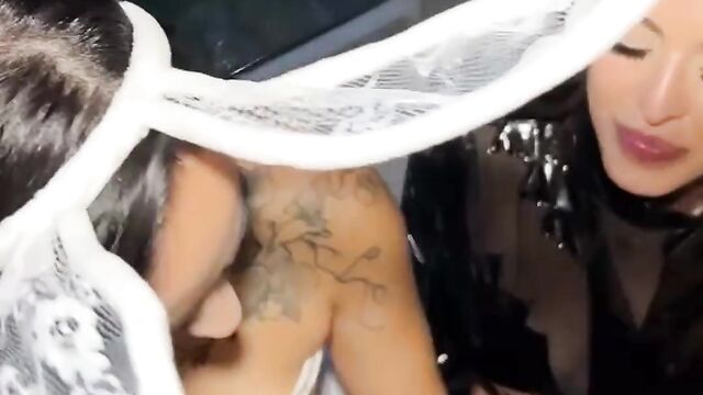 Conquering Sophia Leone and Gaby Ortega at lingerie trailer
