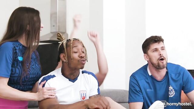Description: As the sports fans cheer for their teams, the sexual tension mounts, leading to unexpected pairings and secret hookups. The sultry Nelly Kent steps away from the group, but instead of checking on her friend Yeri Blue, she finds herself in a sex encounter with him, satisfying her cravings and milking his cum on her big breasts. Meanwhile, the bewitching Carla Boom can't resist the allure of a private moment with Jimmy Bud, indulging in carnal pleasures away from prying eyes. Their unassuming boyfriends are none the wiser to the naughty affairs unfolding behind their backs. Even Kristof Cale needs a break from the tension, only to be cornered by the ravishing Lady Gang, who drops to her knees with one thing on her mind – giving him the sloppiest, most sensual blowjob. Amid the chaos, Jesus goes to the kitchen for a snack refill, but the irresistible Paulina Soul enters the scene, and kitchen counter sex becomes the tastiest treat of the night, risking exposure at every moan. Inevitably caught in the act, accusations fly, but it turns out that everyone has their own dirty little secret. In a moment of raw honesty and insatiable lust, the group realizes there's enough pleasure to go around. Jealousy gives way to lust, and the living room transforms into an orgy of ecstasy.