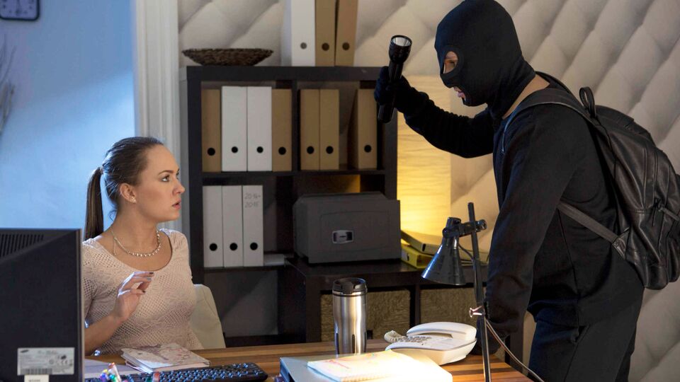 Description: Working yet another Sunday night, Blue Angel couldn't care less about her boring temp job. So when a robber named George Lee comes knocking, she lets him right into the office. "Open the safe!" George yells, waving a flashlight around. But Blue just yawns in his masked face. Hiking up her mini skirt, the bold brunette demands that George seduce her first. Fucking a gorgeous Euro babe for a fistful of cash? What a deal! George doesn't even pause to think before putting his tongue is deep inside Blue's juicy pussy. Foxy, flexible, and feisty, the Hungarian minx bends herself into sexy pretzels on her desk, as the unlikely lovers reach an orgasmic compromise.